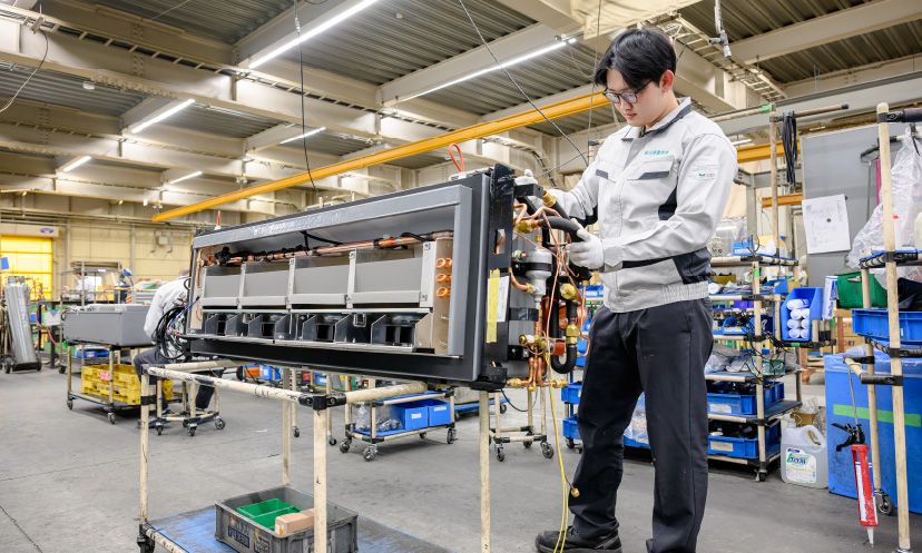快適な暮らしを支えるビル空調システムや、生鮮食品の輸送に力を発揮する冷凍車、液晶ガラス温調機などの熱交換器ユニットの生産において、30年以上に及ぶ豊富な技術を蓄積。各種部品の金型設計から加工、組立、試験までの一貫体制で、QCD(品質・コスト・納期)に優れた熱交換器ユニットを生産しています。